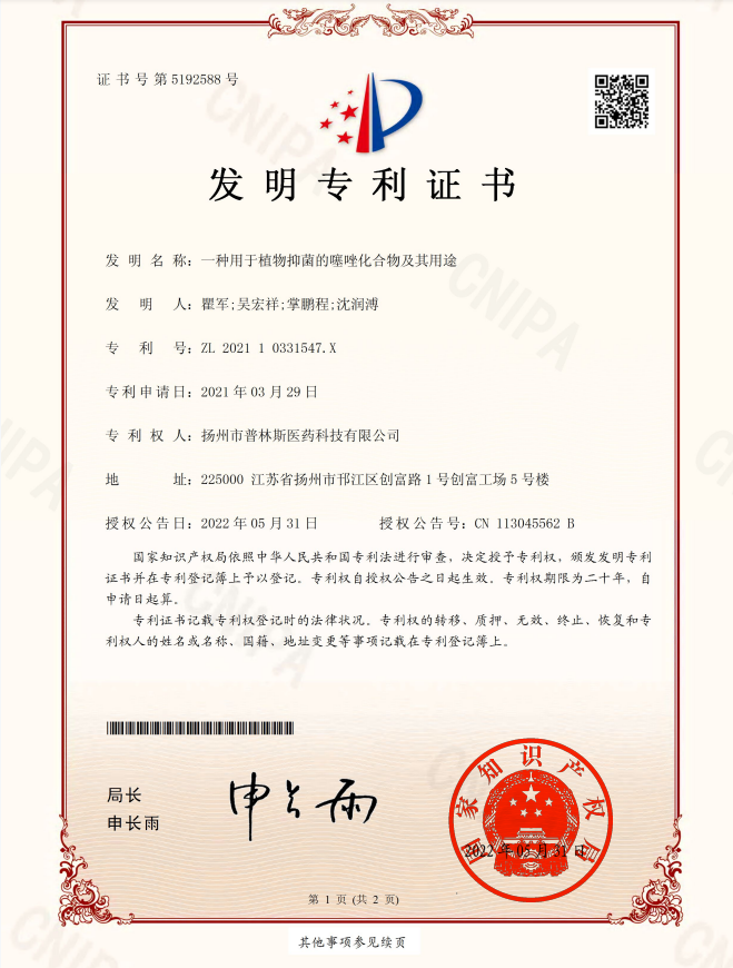 近日,金年会集团下属企业扬州市普林斯医药科技有限公司申报的“一种具有抑菌性能的噻唑化合物及其用途”、“一种噻唑化合物及其用途”、“一种用于植物抑菌的噻唑化合物及其用途”、“一种抑制肿瘤细胞生长的噻唑化合物及其用途”4项发明专利,获得国家知识产权局授权并取得专利证书。